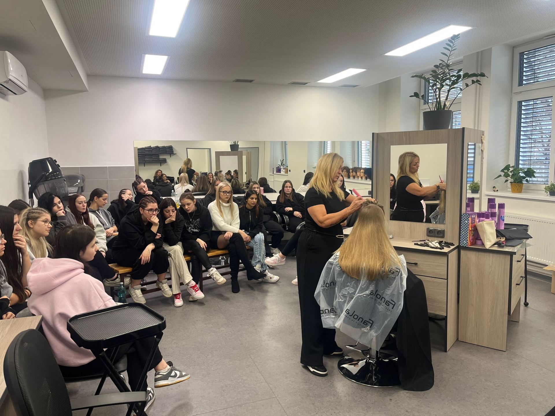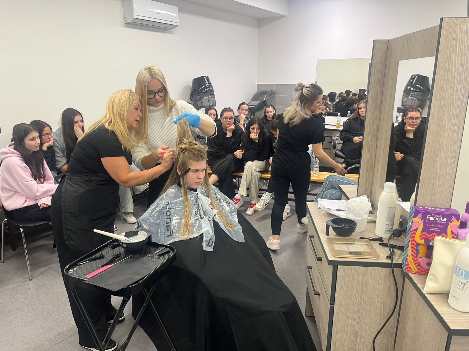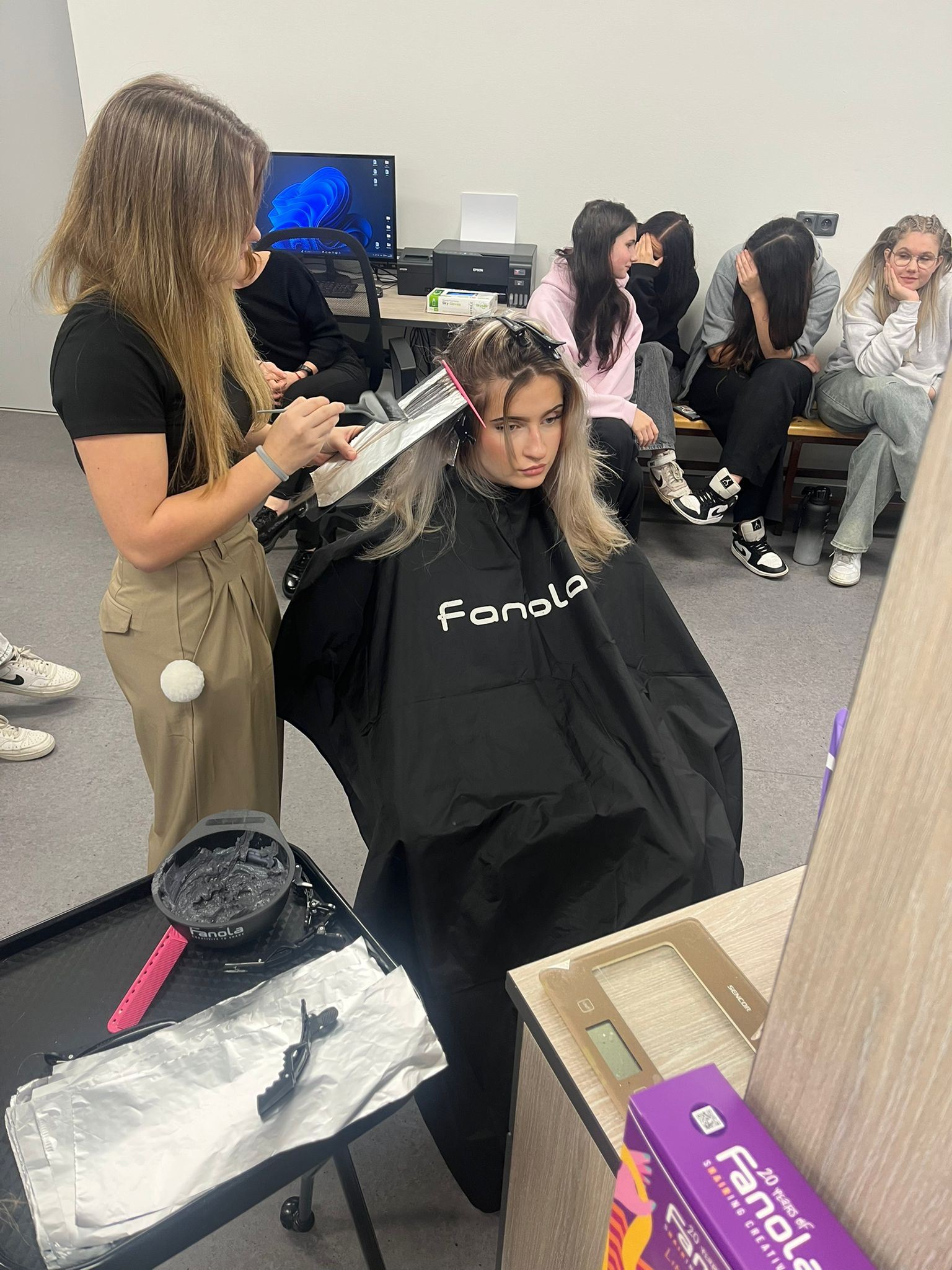 Součástí školení byla také praktická ukázka práce s profesionálními produkty, vysvětlení správného míchání barev a volby oxidantu podle typu vlasů. Žáci si vyzkoušeli aplikaci na modelkách a naučili se, jak komunikovat s klientem o očekávaném výsledku i možných rizicích.